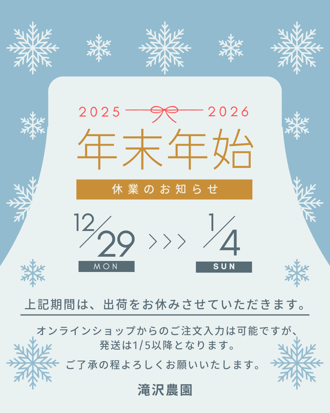 オンラインショップからのご注文入力は可能ですが、発送は2026/1/5(月)以降となります。